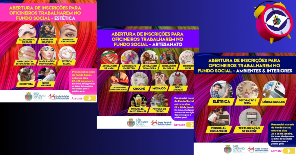 A Prefeitura de São Caetano do Sul publicou o edital de chamamento de oficineiros para as ações em oficinas .As inscrições devem ser presenciais e acontecem entre os dias 22 até 26 de janeiro, das 9hs às 16h, na sede do Fundo Social de Solidariedade (Rua Antônio Bento, 140, Bairro Santa Paula).Os inscritos devem comprovar conhecimento e experiência na respectiva área, observados os critérios de aceitabilidade do projeto e de classificação descritos no edital.