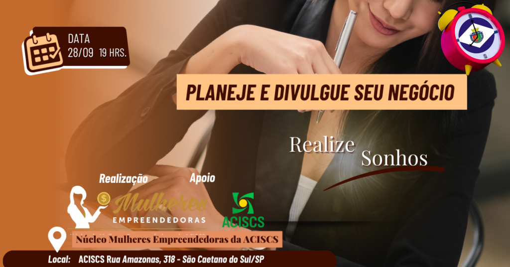 No próximo dia 28 de Setembro a partir das 19hs, no auditório da Associação Comercial de São Caetano do Sul, o Núcleo de Mulheres Empreendedoras da Aciscs realizará a sua reunião mensal: Planeje e Divulgue o seu negócio- Realizando sonhos como objetivo a troca de experiências entre as empreendedoras sobre os negócios e o cenário atual. As empreendedoras ainda terão a oportunidade de realizar o pitch do seu negócio.