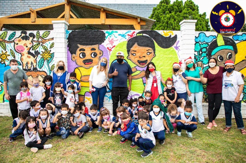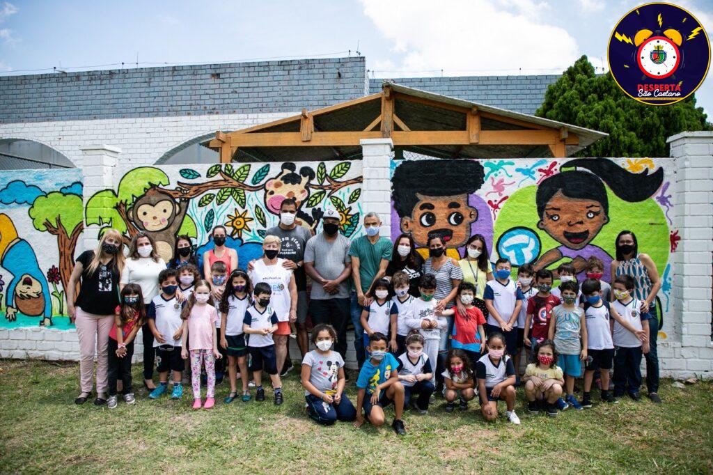 “A pintura foi feita em várias etapas e também contou com a ajuda do pai de uma aluna, que também é grafiteiro. Mas antes da pintura, as crianças assistiram a vídeos sobre graffiti e arte de rua, e conheceram artistas importantes como Os Gêmeos e Kobra”, conta a professora Maria José Suarez.