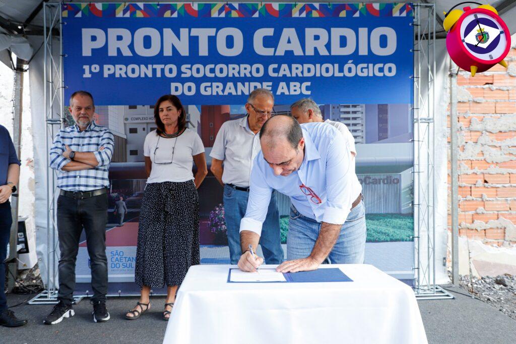 26 de setembro de 2023O prefeito de São Caetano do Sul, José Auricchio Júnior, a secretária de Saúde, Regina Maura Zetone, o secretário de Obras, Iliomar Darronqui e o representante da Construtora Ubiratan (responsável pela obra), João Braga Nobre Correia, assinaram nesta terça-feira (26/9) a Ordem de Serviço para o início das obras de construção do primeiro pronto-socorro cardiológico municipal da região, o Pronto Cardio, localizado na Rua Vital Brasil, anexo ao Complexo Hospitalar de Clínicas.