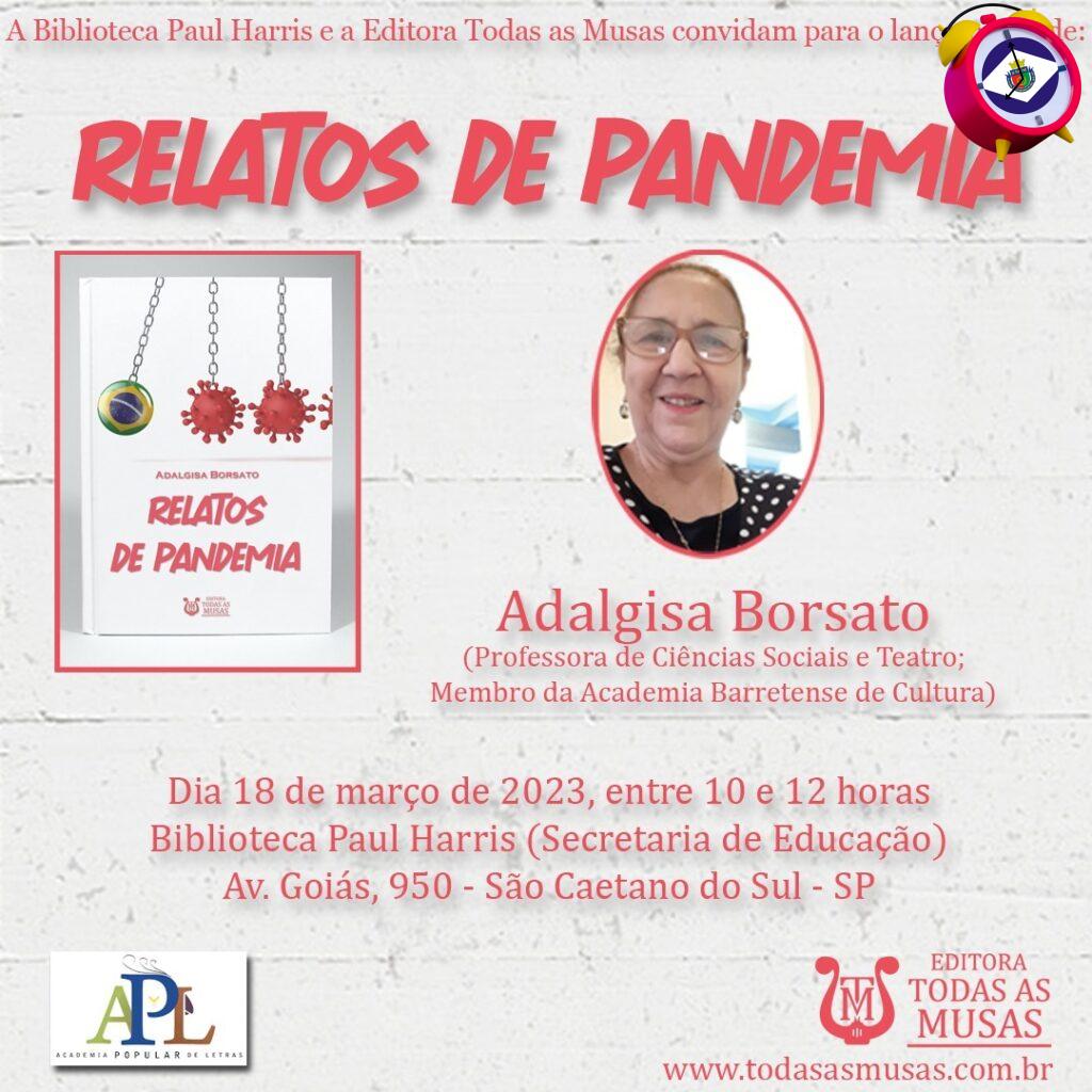 Relatos de Pandemia, de Adalgisa Borsato, Editora Todas as Musas. Segundo a autora, que é professora de Ciências Sociais e Teatro, Relatos de Pandemia nasceu do desejo em deixar escrito momentos inesperados com o surgimento do novo coronavírus, causador da covid-19. “O mundo todo sofreu e chorou com as perdas humanas. O Brasil foi marcado por instabilidades governamentais, principalmente com a falta de políticas públicas na área da saúde. O negacionismo, a indiferença ao isolamento, o atraso e falta de vacinas, o não uso de máscaras, notícias falsas, falta de oxigênio e o uso de medicamentos ineficazes aumentaram o número de mortes”, diz a autora. Todos os relatos foram baseados em informações jornalísticas e em pesquisas científicas.