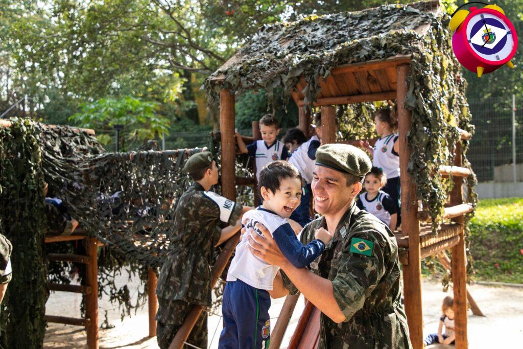 Participaram alunos de 2 a 5 anos, encantados com a camuflagem que deixou o parquinho igual a uma floresta. “Já realizamos atividades educativas em escolas, mas é a primeira vez que atendemos crianças dessa faixa etária. É um prazer estar aqui realizando essa atividade e exercitando a mão amiga do Exército Brasileiro junto à comunidade escolar”, disse o subtenente Leal.