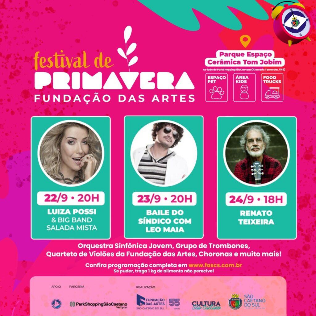18 de setembro de 2023Nos dias 22, 23 e 24 de setembro, o Parque Espaço Cerâmica Tom Jobim, ao lado do ParkShopping São Caetano, receberá o Festival de Primavera Fundação das Artes. Parceria da Fundação das Artes, ParkShopping São Caetano, Secretaria Municipal de Cultura e Prefeitura Municipal de São Caetano do Sul, o evento ao ar livre contará com shows gratuitos, gastronomia e diversão para toda a família, além de ações formativas, como oficinas, workshops e cursos, voltados aos estudantes de música, professores, músicos e demais interessados, realizados nos dias que antecedem o festival.