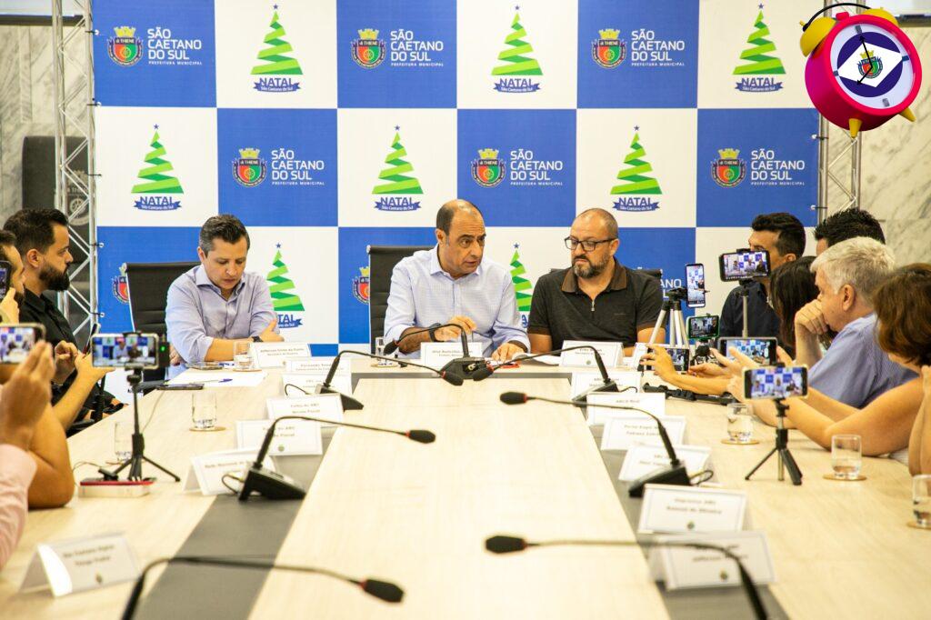 “Este será o maior Natal da história de São Caetano do Sul. Consolidamos esse processo, uma tendência quase que irreversível, que é o poder público abraçar o Natal e organizar atividades em uma ampla programação, para toda a família celebrar”, ressaltou Auricchio. Os secretários municipais de Governo, Jefferson Cirne da Costa, de Cultura, Erike Busoni, e de Serviços Urbanos, Luis Galarraga, também participaram da coletiva.