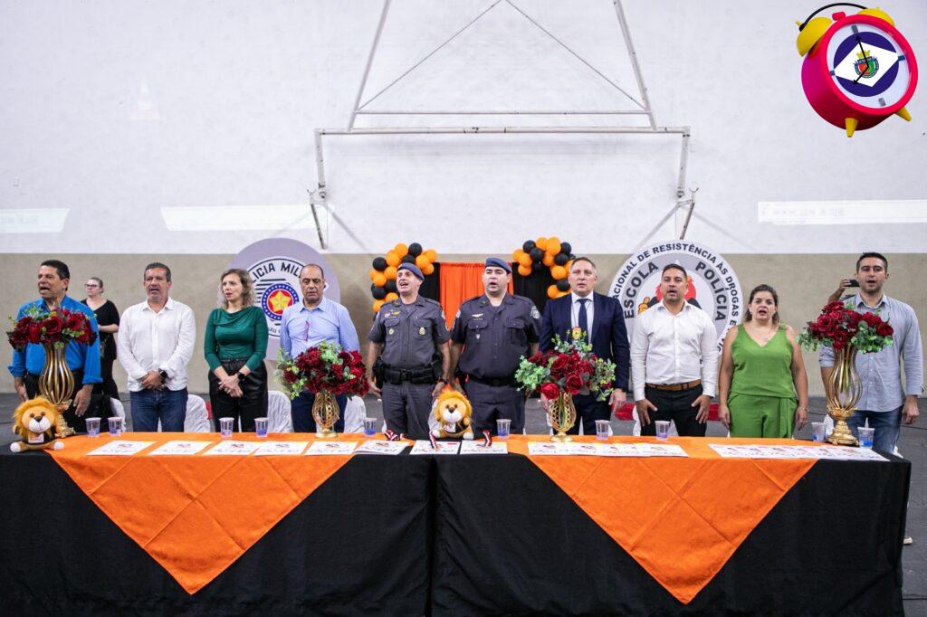 A Prefeitura de São Caetano do Sul, por meio da Seeduc (Secretaria de Educação), numa parceria com a Polícia Militar, realizou mais uma formatura do Proerd (Programa Educacional de Resistência às Drogas e à Violência). A cerimônia ocorreu na noite desta quarta-feira (29/11), no Ginásio Poliesportivo Milton Feijão, no Bairro Olímpico, e reuniu cerca de 1.800 alunos, sendo 570 dos 7º anos e 1.230 dos 5º anos, juntamente com seus familiares.