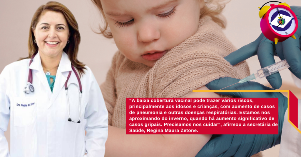 “A baixa cobertura vacinal pode trazer vários riscos, principalmente aos idosos e crianças, com aumento de casos de pneumonia e outras doenças respiratórias. Estamos nos aproximando do inverno, quando há aumento significativo de casos gripais. Precisamos nos cuidar”, afirmou a secretária de Saúde, Regina Maura Zetone.
