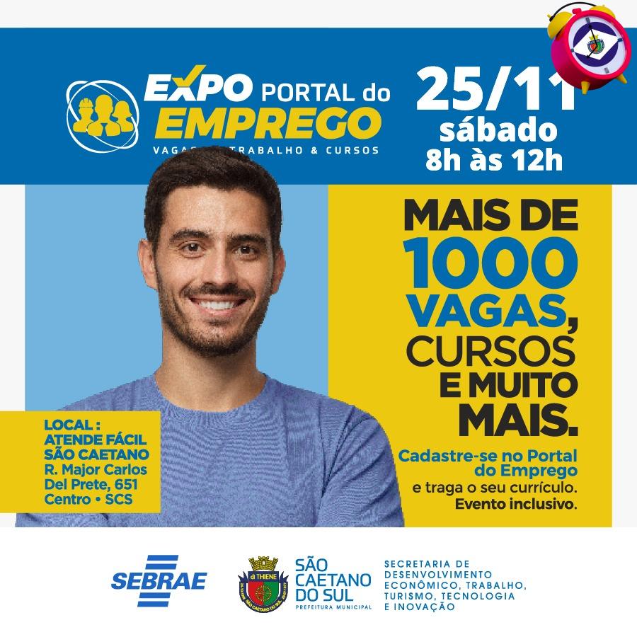 24 de novembro de 2023A Prefeitura de São Caetano do Sul, por meio da Sedeti (Secretaria de Desenvolvimento Econômico, Trabalho, Turismo, Tecnologia e Inovação), realizará o 2º Expo Portal do Emprego, neste sábado (25/11), das 8h às 12h, no Atende Fácil, na Rua Major Carlo Del Prete, 651, no Centro. No evento serão oferecidas 1 mil vagas, que também estão à disposição no site portaldoemprego.saocaetanodosul.sp.gov.br/.