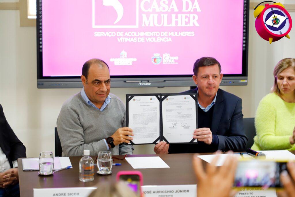 20 de junho de 2023Os prefeitos de São Caetano do Sul, José Auricchio Júnior, e de São Bernardo do Campo, Orlando Morando, firmaram convênio entre as cidades para o acolhimento de mulheres vítimas de violência. O documento foi assinado na tarde desta segunda-feira (19/6), em São Bernardo.